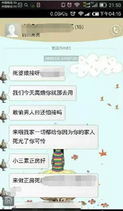小芳想这样下去不是个办法,就向对方发了短信:称自己是外地人,在校大学生,3年前来南充,没有在社会上乱来。请对方冷静处理自己的家务事,不要打扰自己。对方立即开始回短信,其内容不堪入目。小芳不得已回复:如果你再这样,我将报警!对方更是妒火中烧,回复了20多条短信,全是骂人的脏话,十分恶毒和污秽。