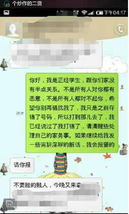 大约过了十多分钟,那名女士又打电话给苑石琦,这回她开始大倒苦水,说自己的老公是一名包工头,家境很富有,大约是5年前她就感觉丈夫在外边“有了人”,但一直没有抓到证据。8号晚间她老公与电话短暂人机分离,是她接到了那个“亲爱的开门”的电话。“我就对她说,被她骂的那个女孩是外地人,3年前才来南充读大学。从时间上推算这个就不可能。又对她讲了误打电话的经过,还请她第二天一早到派出所,当着警察的面叫来那两名大学女生,大家当面把话说清楚。”苑石琦说,“但对方坚决不答应来派出所,叫我自己上门去找她。我就问她的住址,但她坚持不肯透露。最后,我只好反复叮嘱她消除误会,不要再去骚扰那名无辜的女大学生了。她不表态,我又给她晓以利害,称如果她再那样骂人,万一小女孩受不了出了事,她将会负法律责任。”