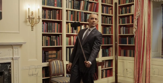 镜头中的奥巴马面对着镜子,扮鬼脸,吐舌头,戴墨镜扮酷,练习演讲,还手持现在年轻人中最火的自拍杆,在白宫里寻找最佳角度,摆pose自拍,玩得不亦乐乎。