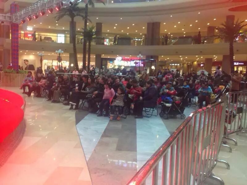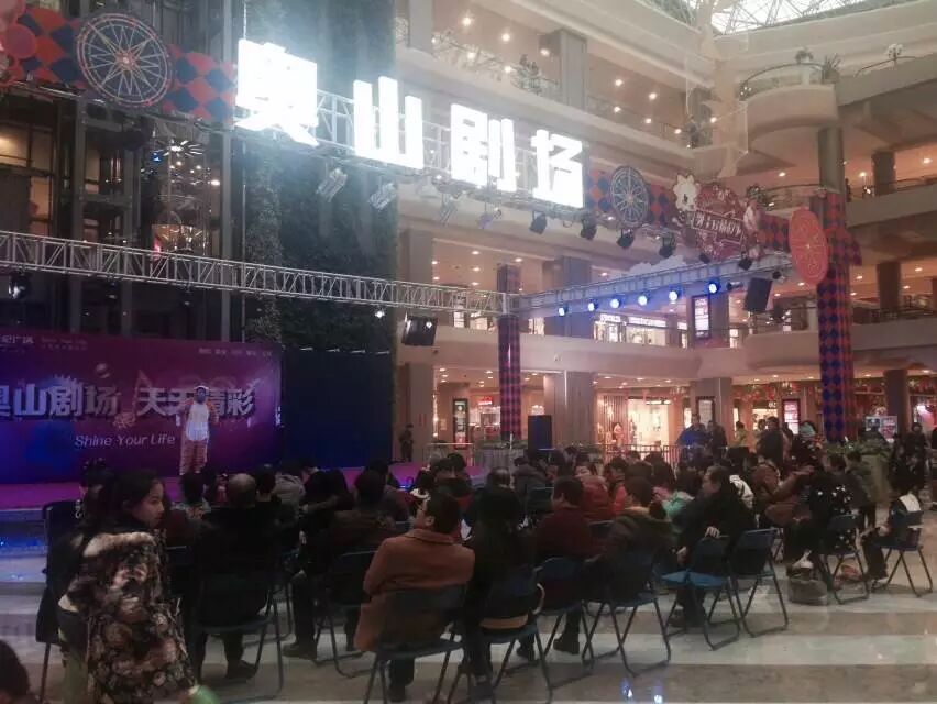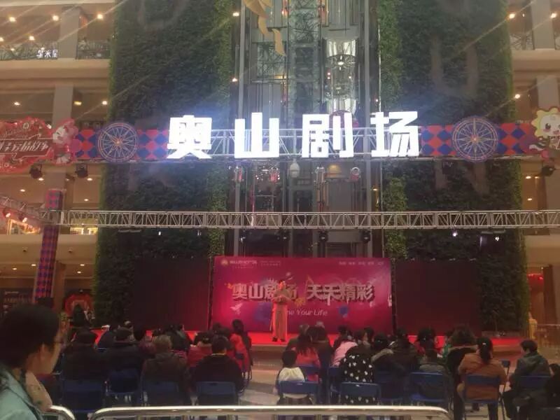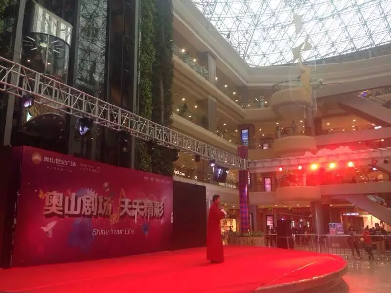 2月24日下午3时许,奥山世纪广场中庭人流开始慢慢增多,他们大多为全家出行,他们愉快的交谈着,顾客们也井然有序的在购物。突然,中庭舞台灯光突然亮起,《新年好》音乐响起,伴随着悦耳喜庆的歌声中新春贺岁话剧开场白在耳边响起,但未见主持人,广场中庭的人们都好奇的张望起来,顺着人群的方向看去,一名穿着红艳衣服的青年在舞台上向观众致意。介绍完毕,广场中庭中央区域出现了两名演员,他们伴随着现场观众热烈欢呼,精彩了开始演出,博得现场观众的阵阵掌声。
