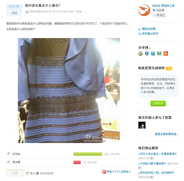 对此,我们稍早也在微博中做了一项调查,结果显示79.7%的网友选择了“金+白”,而这也与国外网站进行的测试结果相当。