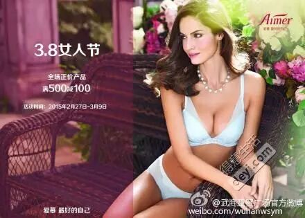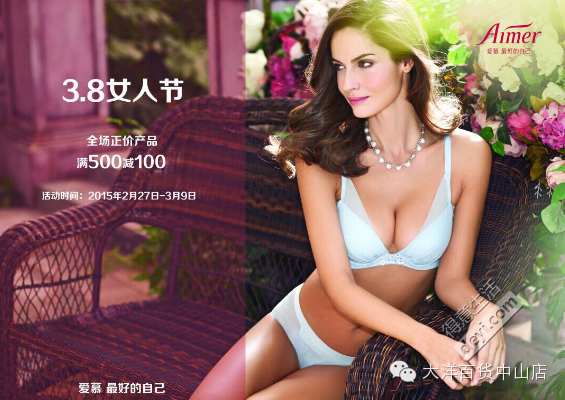 3.8·女人节,爱慕折扣季。3·8生日惠,02.27-03.09,全场正价产品满500元减100元,全场正价产品,买三送一或买五送二