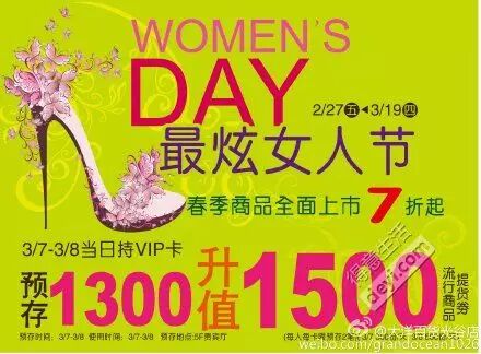 (二)2/27-3/19,春季商品全面上市7折起,3/7-3/8当日持VIP卡预存1300升值1500元流行商品提货券~