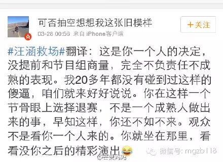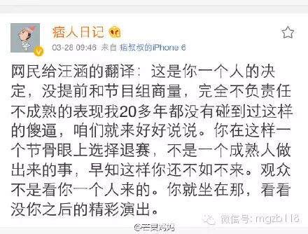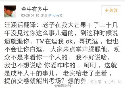 “翻译一下,涵哥那段话意思其实就是老子在湖南台干了20多年,根本不带怕事的!你丫玩撒花了,我照样接着!你跟我玩任性,分分钟不带脏字把你骂出内伤,观众又特么不傻!你丫退出是你的权利,给我老实坐那儿看完!进广告,我们商量下!”