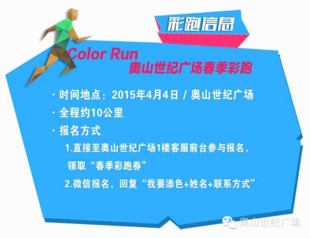 报名时间:截止于4月3日。 报名对象:18-45岁左右身体健康(没有心脏疾病)的热爱运动的朋友。 上装:主办方提供白色文化衫; 下装:易清洗牛仔裤或者运动裤,运动鞋。 彩色粉末为玉米粉,对人体、环境无害。 报名参与赠送纪念T恤 彩跑线路