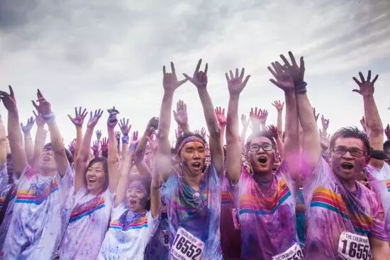 彩跑参加者身着白色T恤,跑步过程中经过不同的彩色站,会被从头到脚抛撒彩色粉末,那五彩缤纷的颜色正是昭示着对生活美好的憧憬,对灿烂人生的希冀。