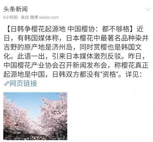 3月29日,中国樱花产业协会召开新闻发布会,称樱花真正起源地是中国,且有日本权威的樱花专著证实,日韩双方都没有“资格”。