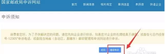 点击“我要申诉”之后,网站会弹出一条提醒,也就是之前说明的,在国家邮政局网站申诉的前提是:已向企业投诉,且投诉无果或者不满意。我们点击“继续申诉”,就可以把你快递过程中遇到不公的事情说出来了。