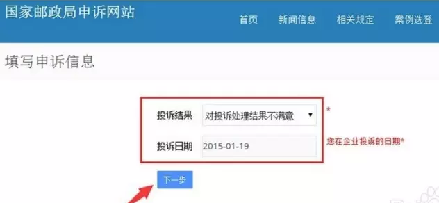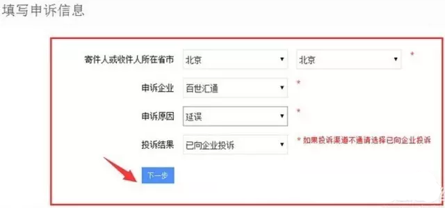 进入填写申诉信息页面之后,填上投诉的基本信息,如地址、快递公司、申诉原因等,下图是笔者随便选的快递公司,不要当真,另外如果投诉的渠道不通,也可以选择“已向企业投诉”,然后点击“下一步”(其中*为必填)。