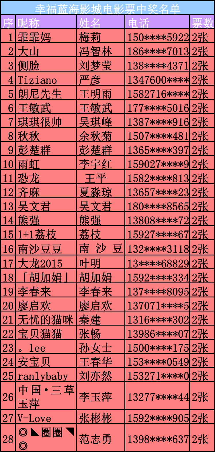 3月30日,幸福蓝海影城,电影票获奖名单如下: