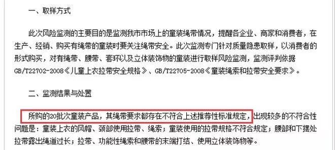 今年2月份,武汉市质监局以消费者身份,购买了市场上20个批次的童装,检查后发现样品绳带全部不符合规定。