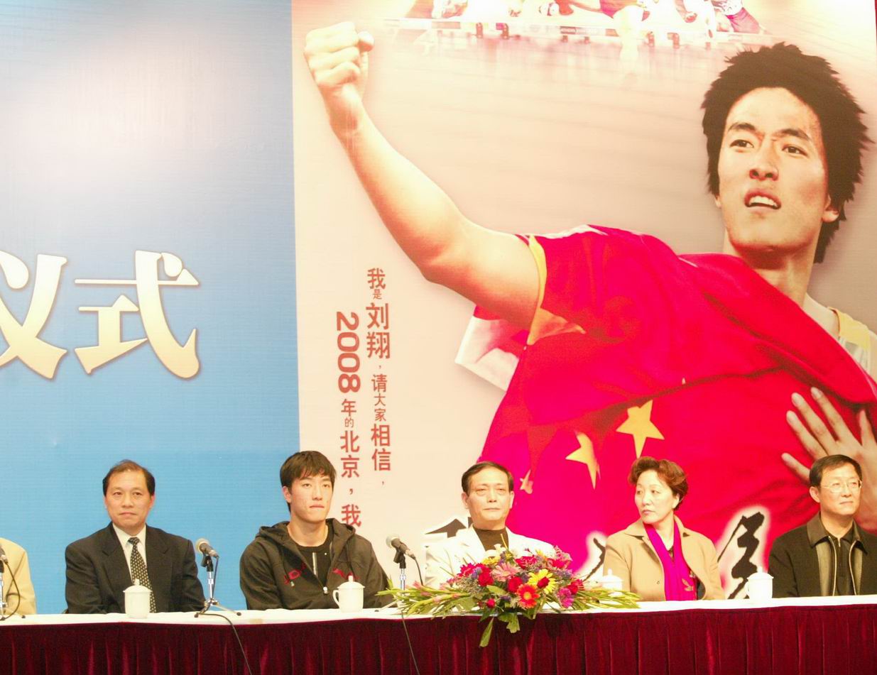 2004年奥运会夺冠后,刘翔和父母等一同参加新书发布会