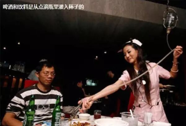 台湾有家主题餐厅经营风格另类,服务生穿上护士服,餐桌上还有提供饮料的“点滴”。进入餐厅后,客人甚至可以要求坐在轮椅上,请服务生帮忙推进去。餐厅内墙壁上挂X光片、视力测量表,饮料则在点滴瓶内。另有试管饮料,由服务生推着“护理推车”,用针筒把“试管酒”饮料“注射”到消费者嘴巴里。