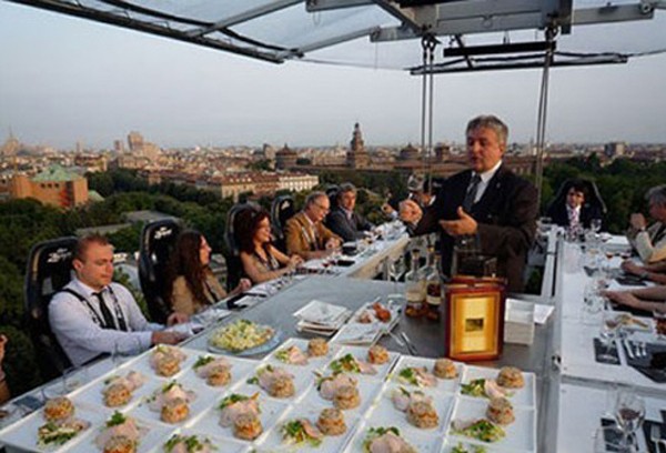 2008年8月25日,16名客人在离地50米高的“空中餐厅”享用一顿大餐。这个被叫做“空中餐厅”的项目是由一家德国探险体验公司推出的,食客如果想要在这个被起重机悬吊起来的餐厅品尝美味,每个人需要花费159欧元。而想试的朋友也不用跑到德国那么远去,最近在中国的上海也已经有了这样的“空中餐厅”了,大胆的你可以去挑战一下了。