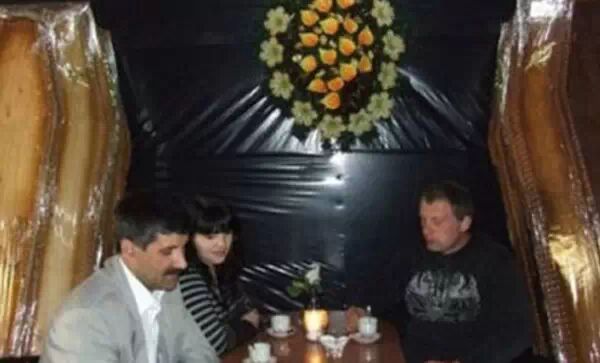 乌克兰一家丧葬机构想用户所想,急用户所急,独出心裁,最近建成世界上第一家棺材餐馆。有意思的是,餐馆并非徒有其名,它推出的一道道美食,也全与死亡有关。这家餐馆建在一具大棺材里。棺材长20米,宽6米,高6米,里面用花圈和一些与丧礼有关的物品装饰。如果你足够大胆,还可在点菜之前浏览菜单上的丧葬品,包括以当地丧葬仪式命名的“9日”沙拉和“40日”沙拉,以及一份名为“天堂相会”的菜,桌子上点燃的单数蜡烛也烘托出葬礼的肃穆气氛。