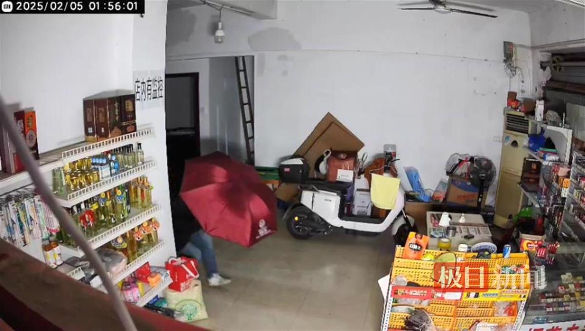 便利店的监控视频显示,当日凌晨1时55分,一名男子打着一把大红色雨伞,弯着腰,蹑手蹑脚进入店内。男子的膝盖以上全部被雨伞遮挡,从膝盖以下露出的部分可见,该男子穿着蓝色牛仔裤、白色运动鞋。