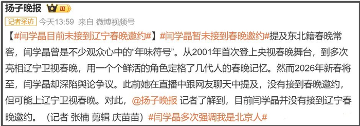 实际上,也有媒体去了解了一下,得到的消息是闫学晶并没有接到辽宁卫视春晚邀约。
