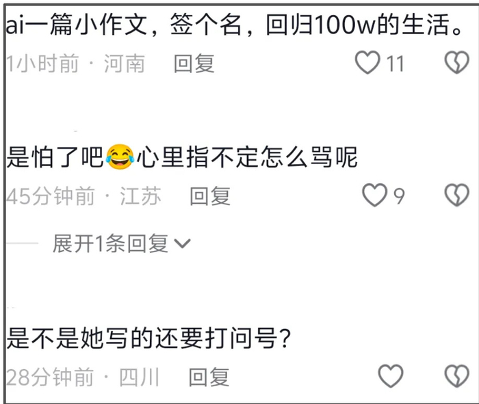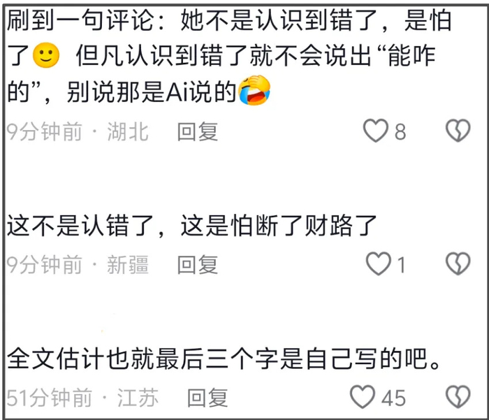 在网友看来,闫学晶母子二人道歉并不诚恳,所谓道歉信充满ai味,怀疑全文只有签名三个字是闫学晶自己写的。