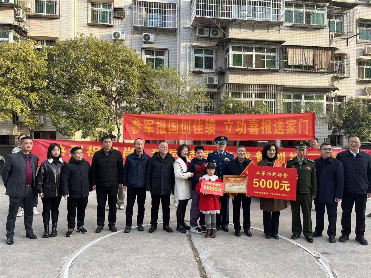 此前一天,武汉市蔡甸区汉阳大街茂源社区农业银行宿舍区锣鼓喧天、气氛热烈,由军地联合组成的报喜团为肖玮及其家属送上了立功喜报。作为中国人民解放军某部空军上校、特级飞行员,肖玮在21年的飞行生涯中,保障安全飞行2000小时,于2025年12月31日被批准授予二等功。
