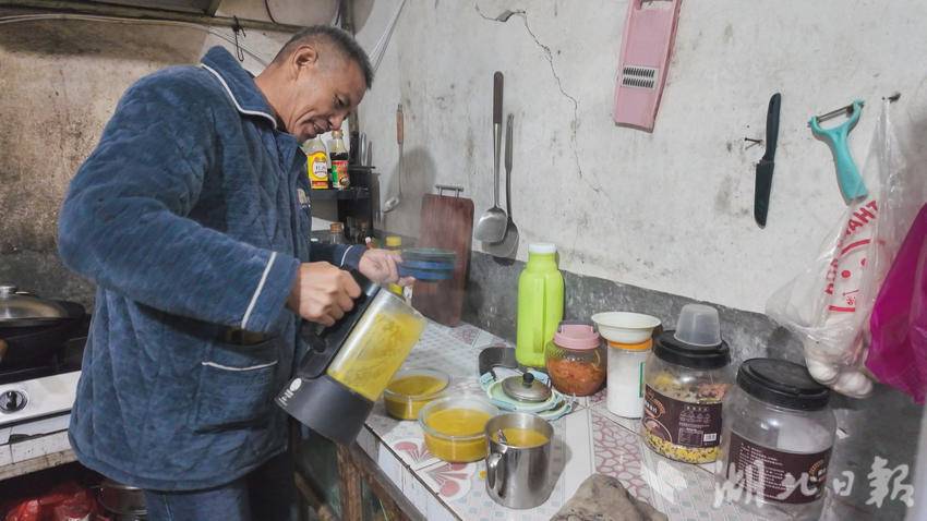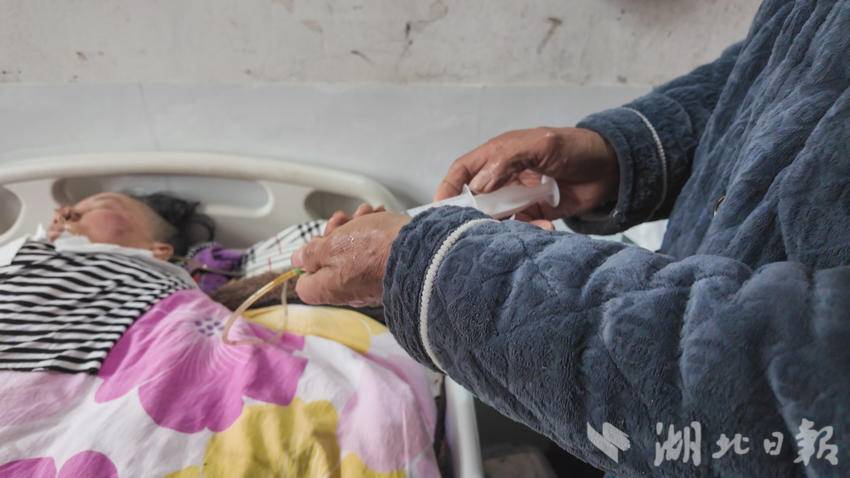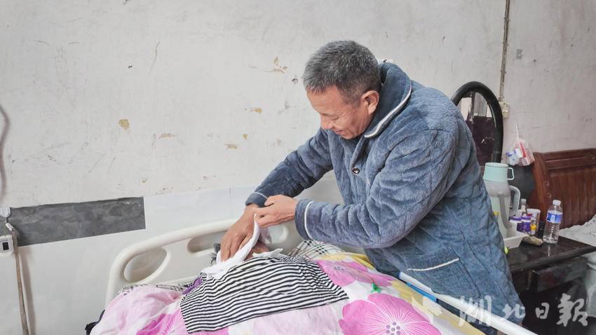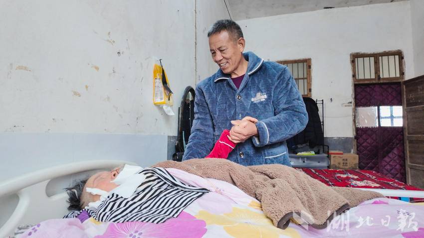 湖北日报客户端讯(通讯员田明 徐功频邹亚峰)在崇阳县青山镇西冲村的一间农家小院里,63岁的揭金水每天重复着同样的生活节奏:清晨六点起床,烧好温水为妻子擦身、翻身,将精心搭配的食材打成糊状,通过鼻饲管缓缓喂给卧床的爱人;中午趁着阳光正好,给妻子按摩僵硬的肢体,轻声讲述村里的新鲜事;夜晚定时起身查看被褥干湿,为妻子清理污物——这样的日子,他已坚守了整整6年。病床上的59岁妻子陈七兰,因6年前突发脑动脉瘤术后成为植物人,丈夫揭金水用日复一日的精心陪护,诠释着“执子之手,与子偕老”的真谛。