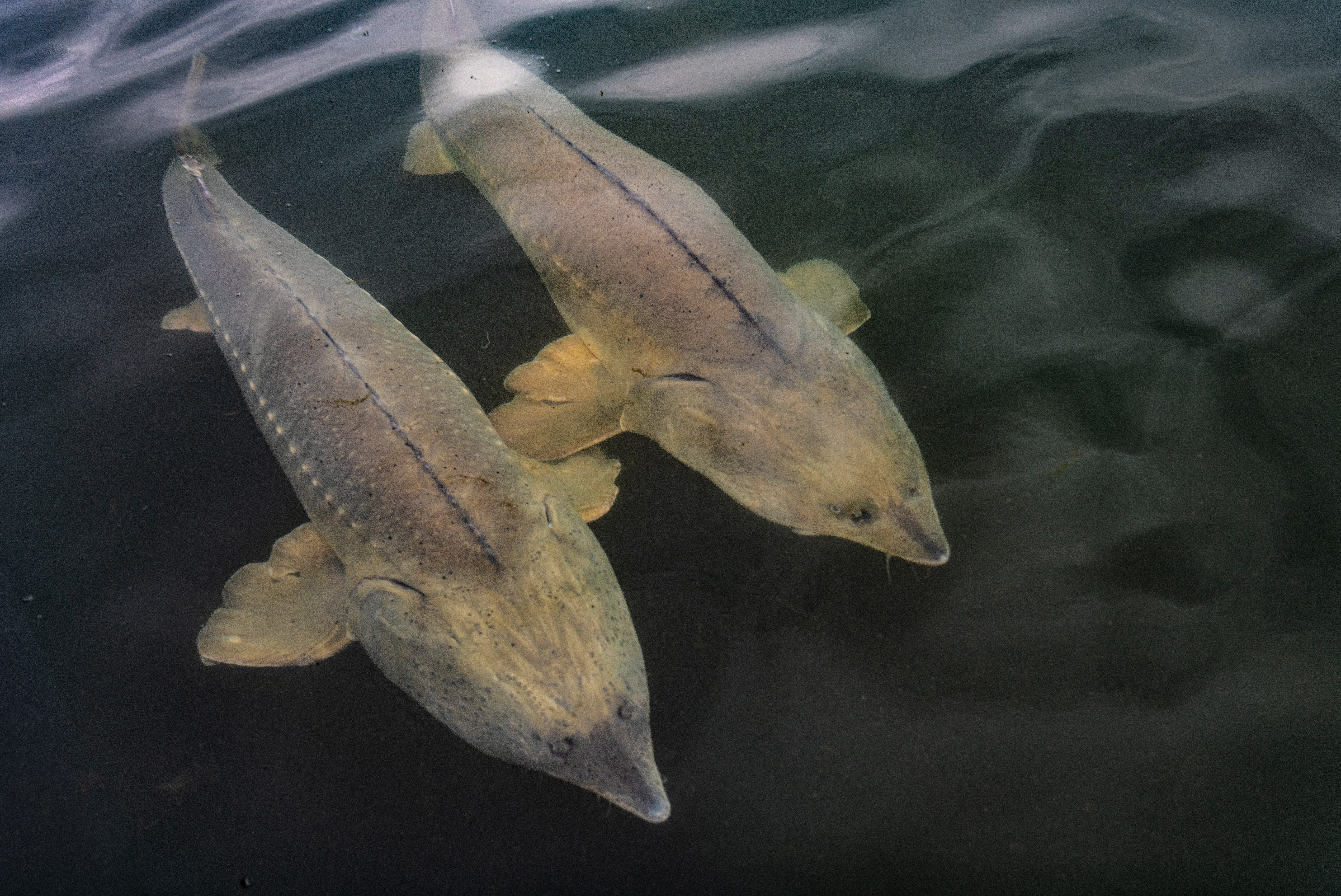 在保康县马桥镇中坪村,工作人员在鱼塘内查看鲟鱼生长情况。陈泉霖 摄