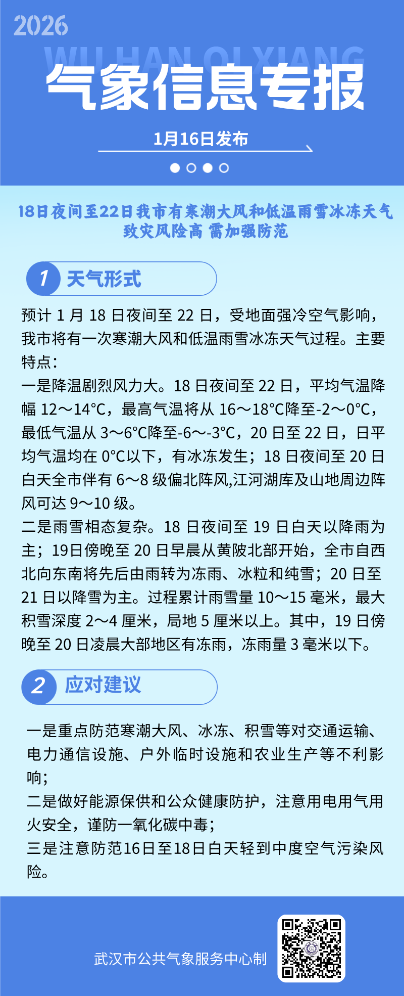 武汉市气象局提醒,本轮寒潮天气主要特点如下: