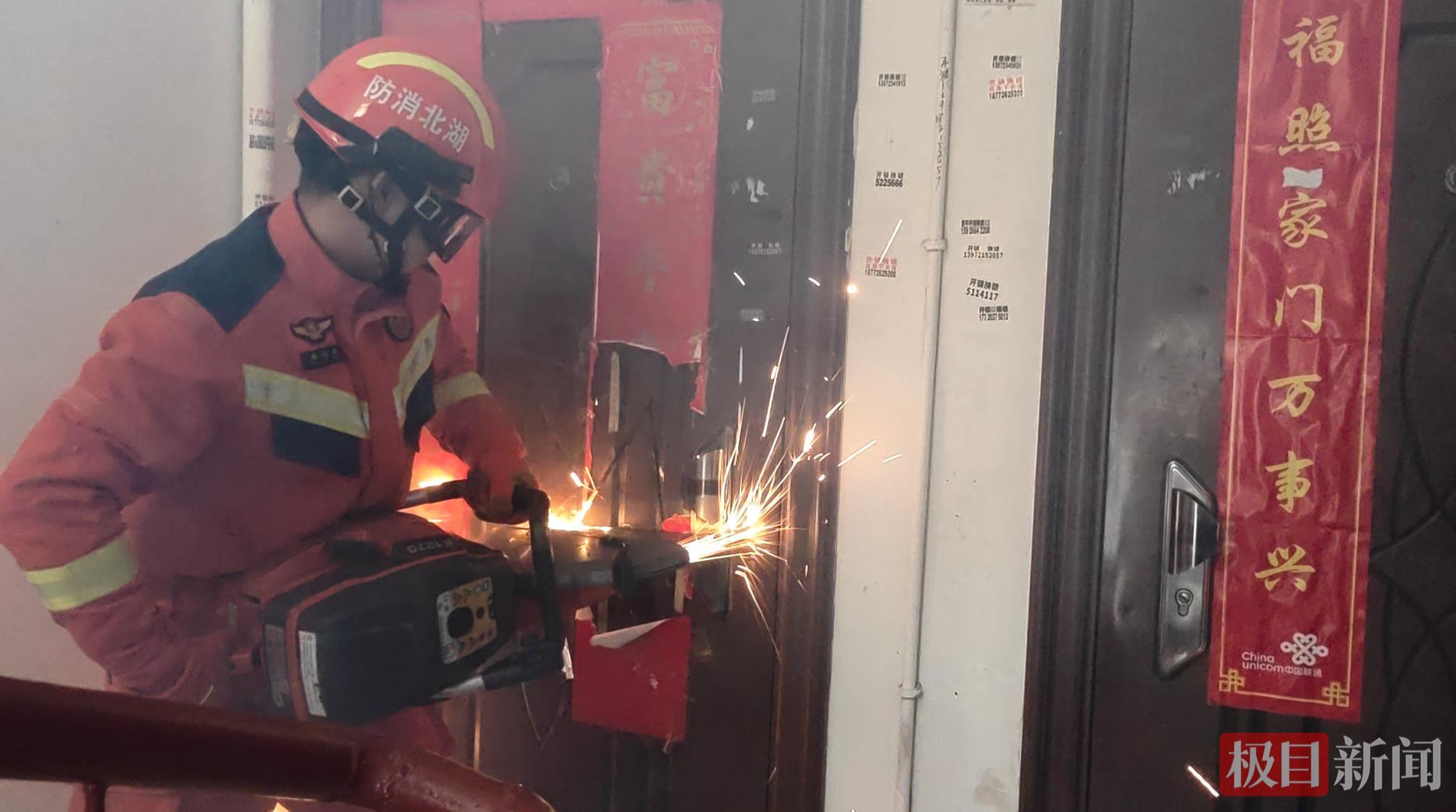 在确认现场安全、做好防护措施后,消防员使用专业破拆工具,对防盗门锁具进行精准、快速破拆。用时2分钟,房门被顺利打开。
