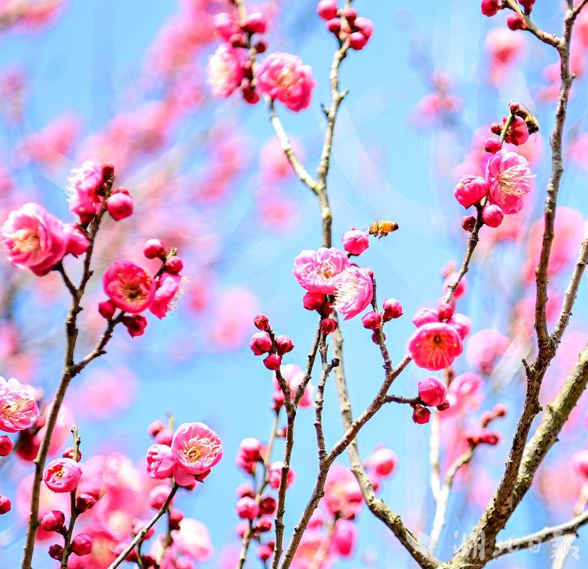 踏入梅园,不同于盛花期的绚烂夺目,初绽的红梅更显清逸雅致。苍劲的枝干上,一朵朵红梅疏密有致地分布。有的含苞待放,像红宝石般点缀在褐色枝干上;有的早已吐蕊迎红,重重叠叠的花瓣在明媚的阳光下显得格外晶莹剔透。微风掠过,纤细的花枝轻轻摇曳,缕缕暗香若有似无,沁人心脾,引得勤劳的蜜蜂在花间忙碌穿梭。