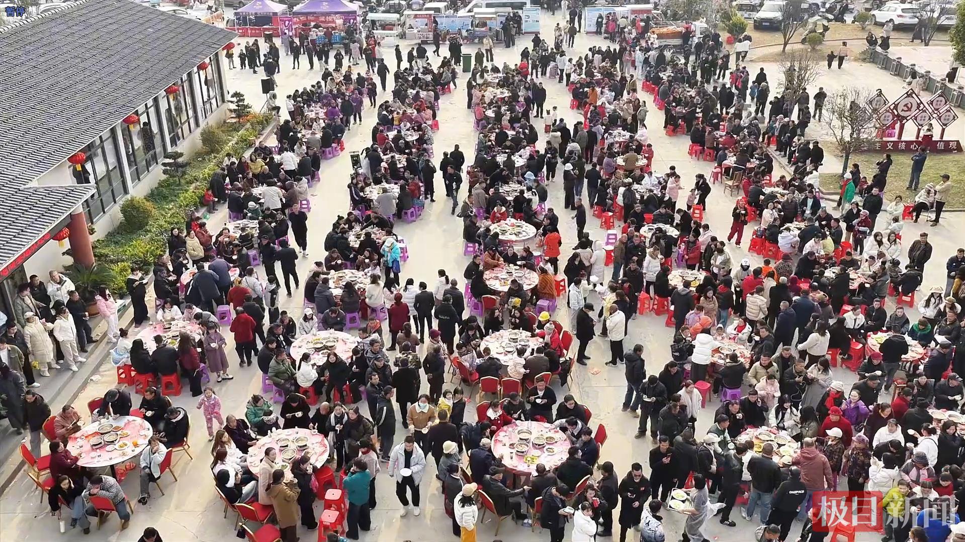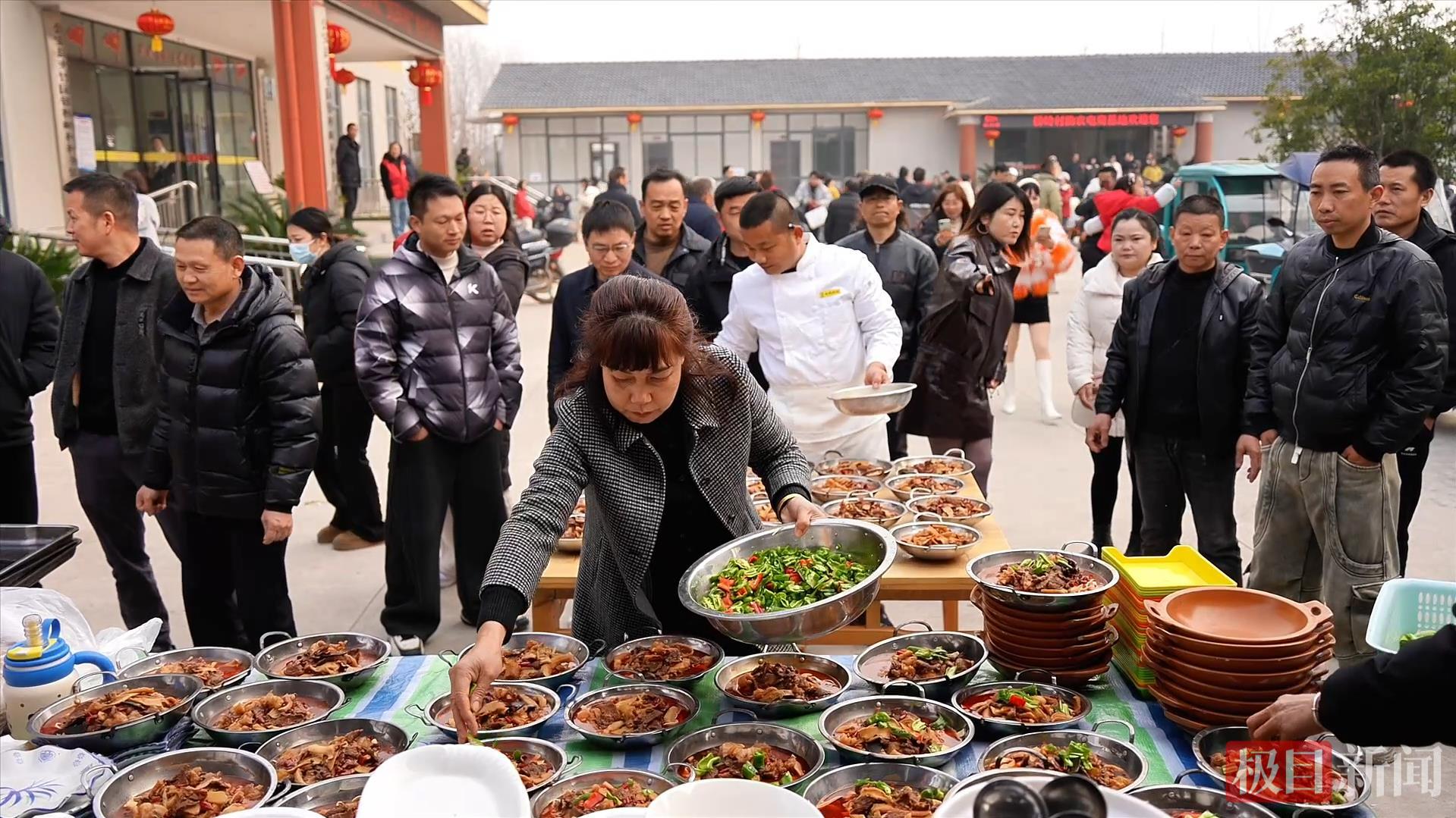1月17日,湖北省荆州市公安县夹竹园镇桥岭村举行杀猪宴,邀请附近村民免费品尝。活动现场,桥岭村不仅宰杀了2头生猪,还采购了100多斤鱼糕、600斤牛肉和30桶罐装牛肉,现场共烹制了85桌宴席。
