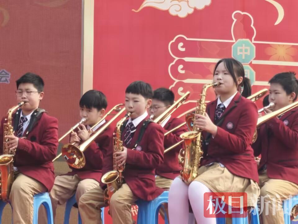在热闹吉祥的祥狮献瑞表演之后,武汉音乐学院10多名学生带来《我乘着风飞过来》,清纯甜美的歌声瞬间吸引大家的目光;北大邦学校学生的器乐合奏《我们是共产主义接班人》铿锵有力;葫芦丝独奏《赛马》、咸安山歌《灯哪灯》、川剧变脸《楚韵》……轮番上演的音乐艺术让观众陶醉。