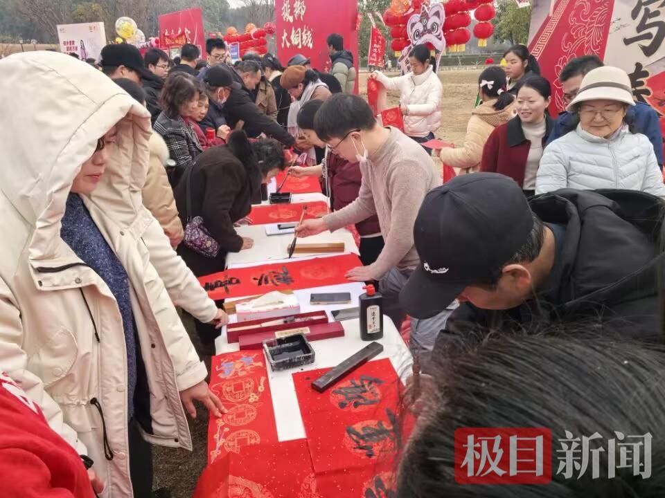 场地中间,一场乡村音乐节正激情上演,两边130多个特色农产品市集购销正旺,区妇联推出脱单相亲咨询服务,区总工会宣传相关政策,区文联带领区书协10名书法家现场书写春联500副赠送观众,让肉香、米泡香和墨香一起伴着歌声飘进人们的乡村记忆里。
