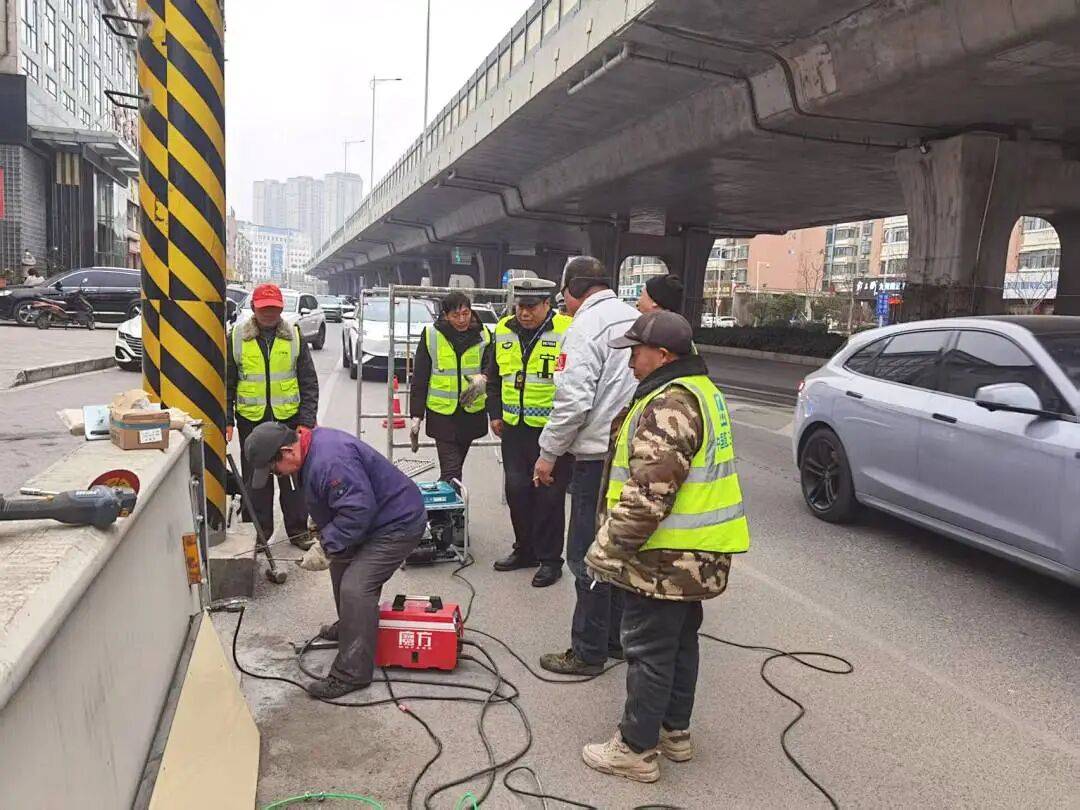 ▲襄阳交警在城市快速路各路段上下匝道安装物理闸栏,将融雪剂等物质先期投放到匝道出入口位置。