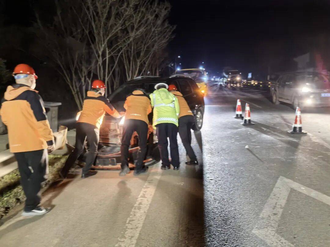 ▲鄂州交警为应对恶劣天气,在重点路段加强路面管控和交通疏导。