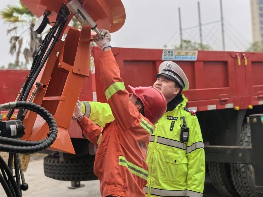 ▲鄂州交警对恶劣天气应急物资储备、机械设备等进行检查,确保所有设备处于良好待命状态。