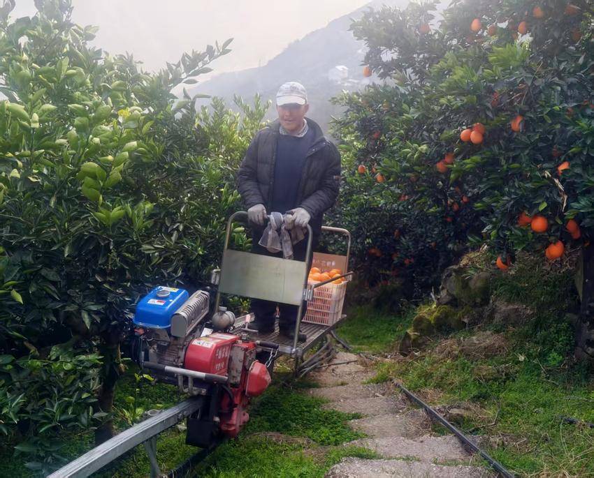 轨道车穿梭:老农轻松运柑橘