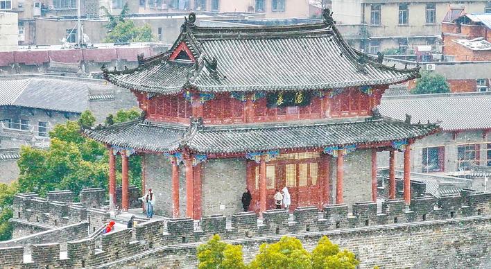 1月19日下午,风雪中的襄阳古城。 (湖北日报全媒记者 赵怡然 摄)