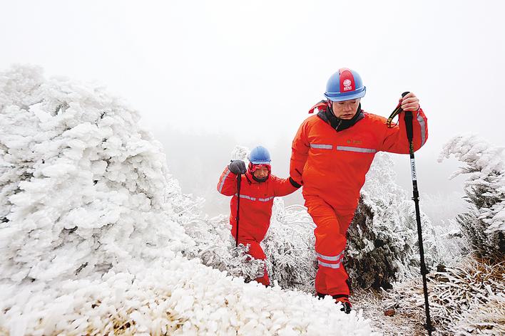 1月19日,国网孝感供电公司输电运检人员冒着严寒巡检110千伏凤界线。(湖北日报全媒记者 王欣 通讯员 余健兵 摄)