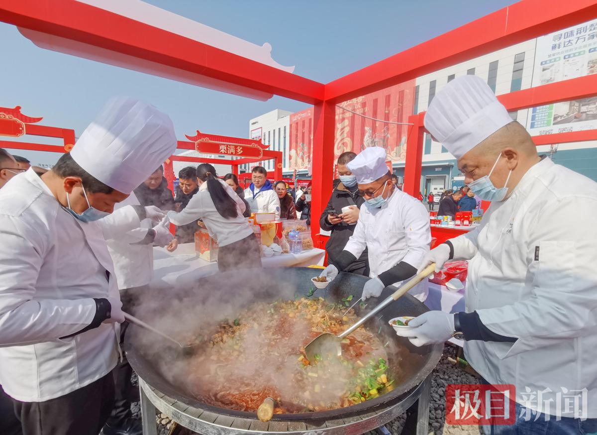 新闻记者在松滋鸡市集展位前看到,参展企业支起一口直径1米多的大铁锅,将新鲜宰杀的土鸡现场烹饪,并向市民和游客发放。