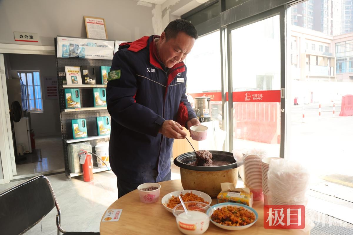 腊月寒冬,江城武汉的清晨格外清冷。1月24日清晨6点,天还未亮,中国石化湖北武汉石油五丰二加能站站长黄克毅已经起身前往菜场,采购腊八粥所需食材。一小时后,站内厨房飘出阵阵粥香,一大锅热腾腾的腊八粥已经熬制完成。