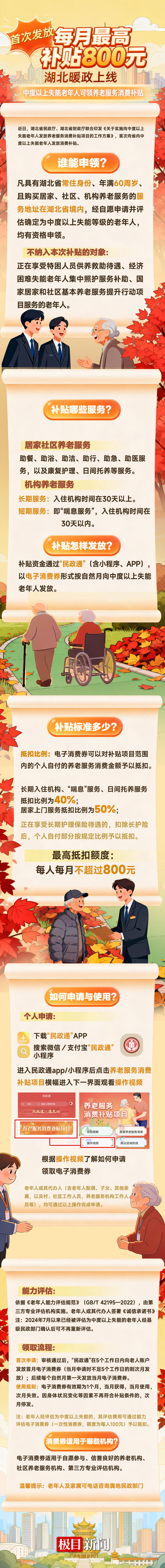 湖北省近日首次推出面向中度以上失能老年人的养老服务消费补贴。符合条件的老年人可通过“民政通”平台线上申领电子消费券,用于抵扣助餐、助浴、康复护理、日间托养以及机构养老等多项服务费用,每月最高可领800元。