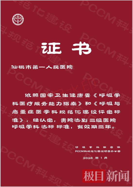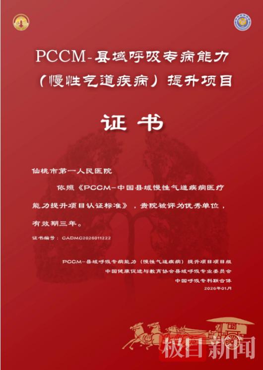 近日,仙桃市第一人民医院呼吸与危重症医学科(PCCM)连获两项国家级殊荣:顺利通过国家呼吸与危重症医学科规范化建设工作小组的严格评审,获评“国家呼吸与危重症医学科规范化建设三级医院达标单位”;同时,在县域慢性气道疾病提升项目建设考核中,凭借全程管理服务与显著成效,荣获“县域慢性气道疾病提升项目优秀单位”称号。这标志着仙桃一医呼吸学科规范化建设和慢性气道疾病防治水平已跻身全国县级医院先进行列,为区域呼吸健康服务体系建设提供了有力支撑。