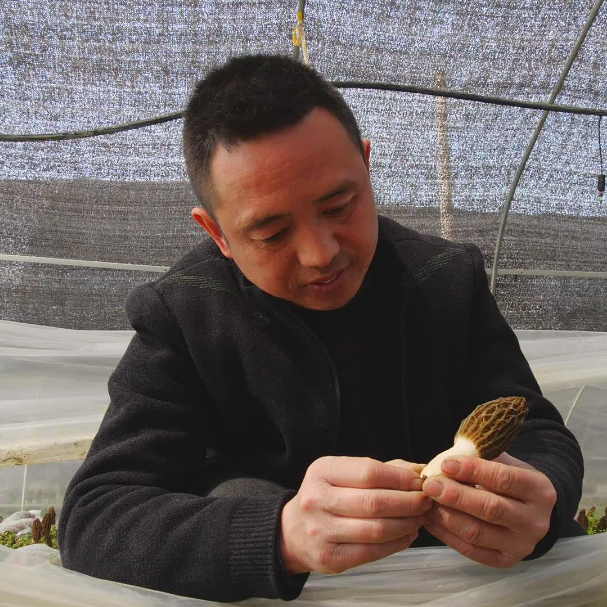 覃斌建正在采摘丰收的羊肚菌张鹏亮摄