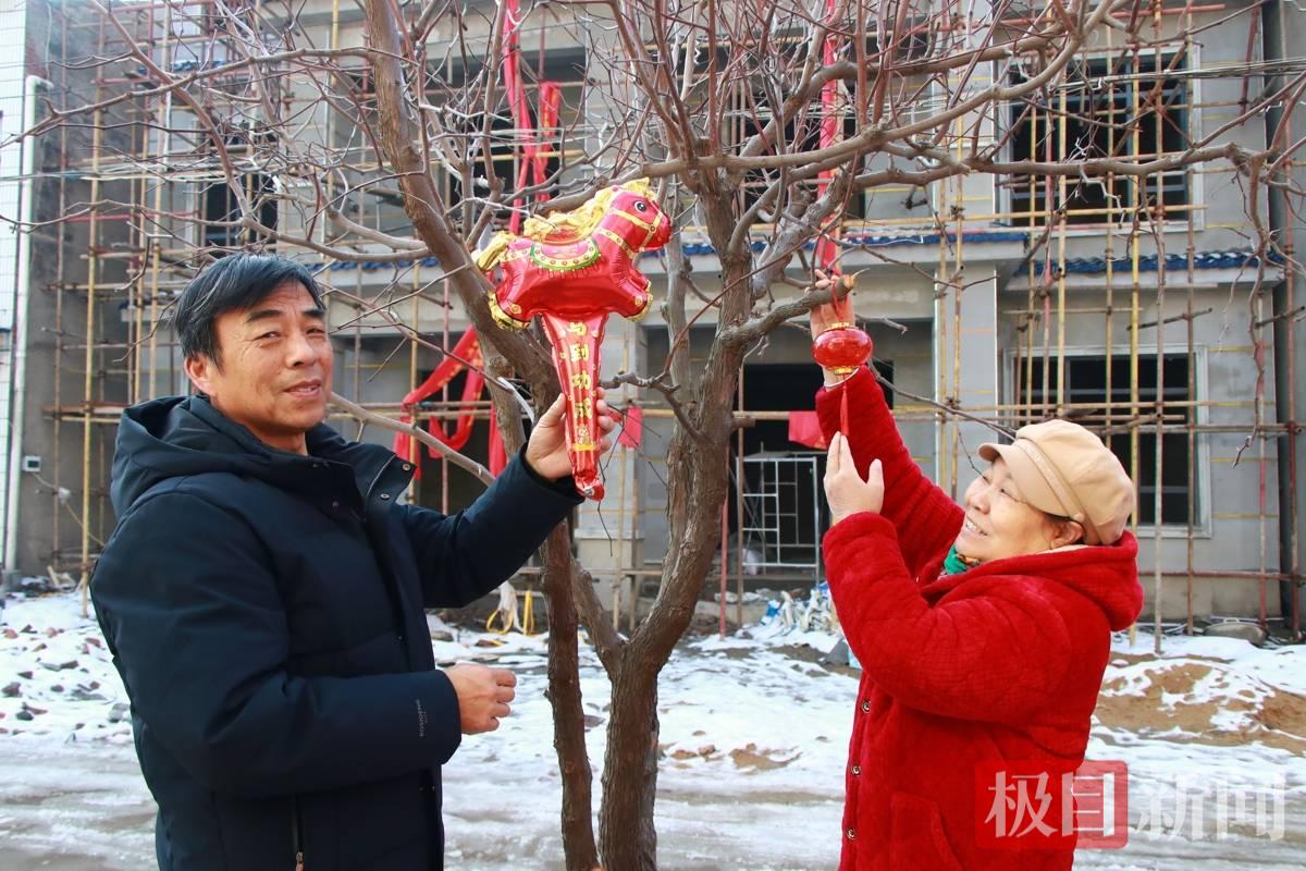 王想仿和爱人在即将建好的新房前挂新年饰品(通讯员罗珊珊摄)