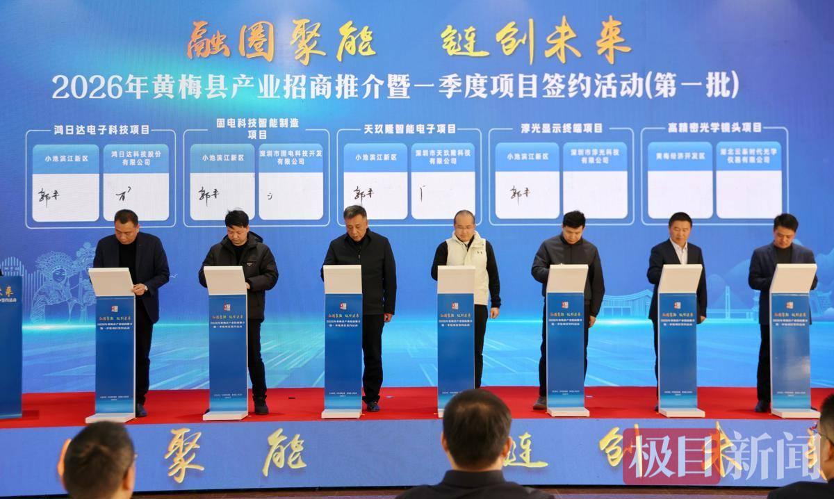 1月23日,黄梅县产业招商推介暨“开门红”项目签约活动在小池滨江新区举行。活动聚焦光电通信材料、纺织服装、农副产品深加工三大主导产业,签约11个产业链关键项目,以链式招商强化产业集群效应,为黄梅“十五五”开局注入强劲产业动能。