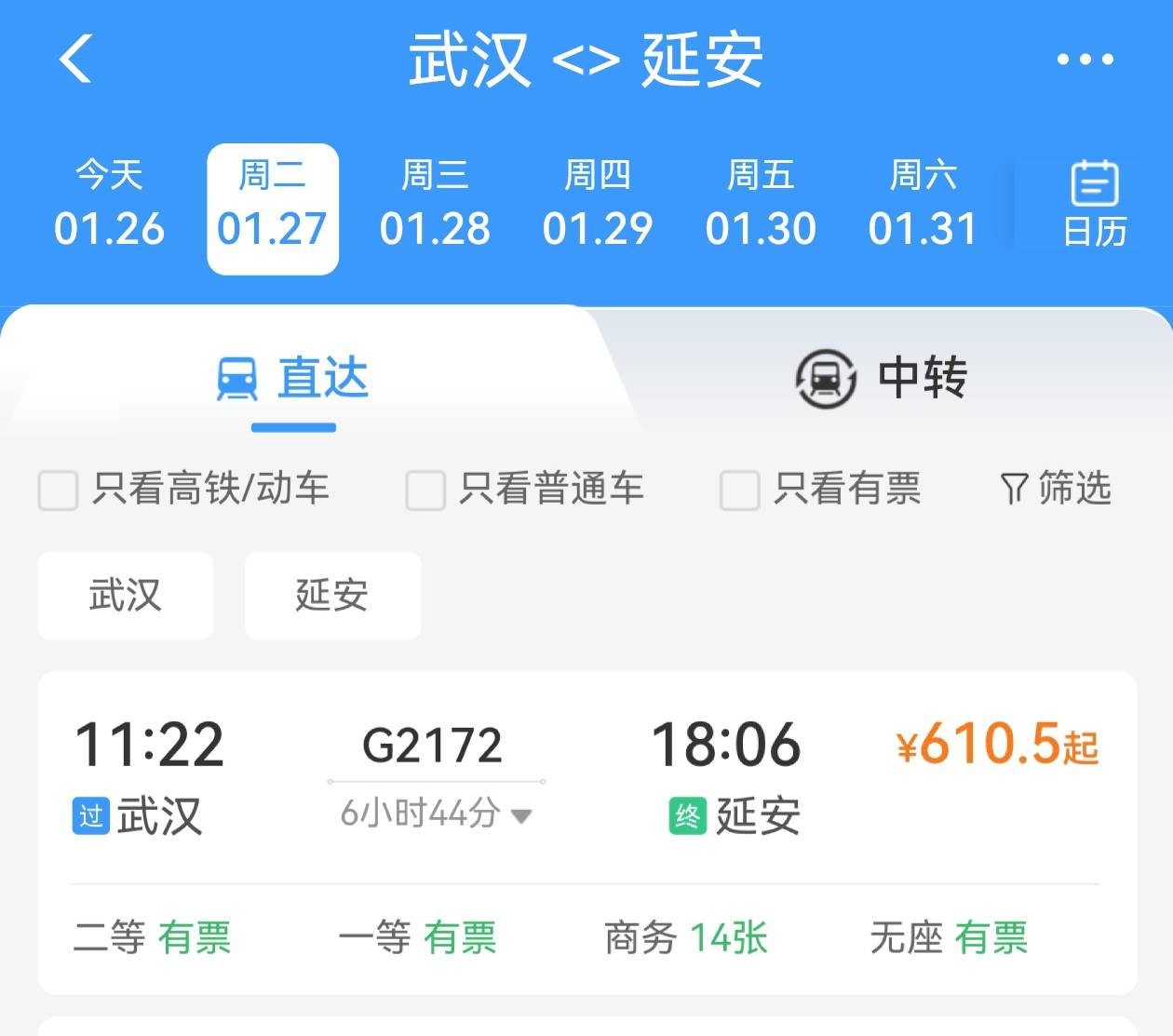 湖北日报讯(记者胡祎)12306APP显示,1月27日起,G2172次列车将正式开行。该列车由中国铁路西安局集团有限公司西安客运段担当乘务,从广州始发,终到延安。