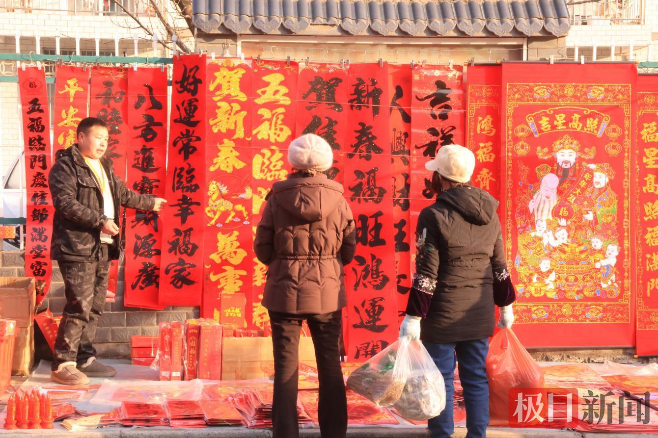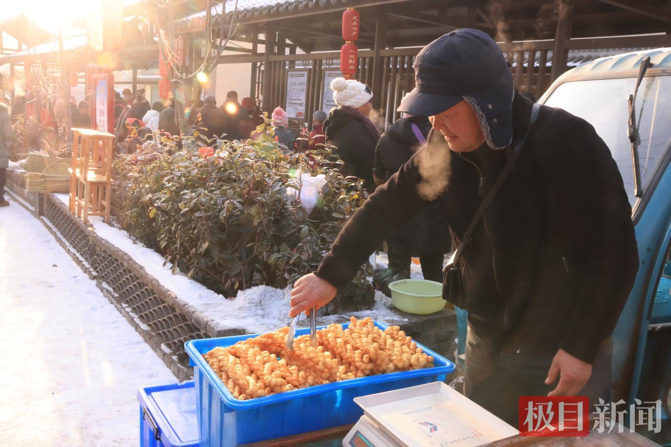 活动当天清晨,赶集现场人头攒动,火红的灯笼挂满街巷,春联和福字相映成趣,商贩的吆喝声、孩童的嬉闹声与歌舞锣鼓声交织在一起,奏响了最鲜活的年俗交响曲。前来赶集的群众早早占好了摊位,一字摆开,整齐排列。集市上的商品琳琅满目,马头山羊鲜肉色泽明亮,麻花酥脆可口,回族传统油香馓子等特色商品香气四溢,既有“山货”的淳朴本味,又有民族风味的独特魅力,高山土豆、包菜、核桃等特色农产品和柿饼、土蜂蜜等林下珍品让游客朋友们目不暇接,来自竹溪的商户李万权已连续多年参加湖北口年货节,他的茶叶摊位前客流不断:“这里赶集的人多,跨省的顾客也多,不到两个小时就卖了不少,销量比平时翻了倍!”