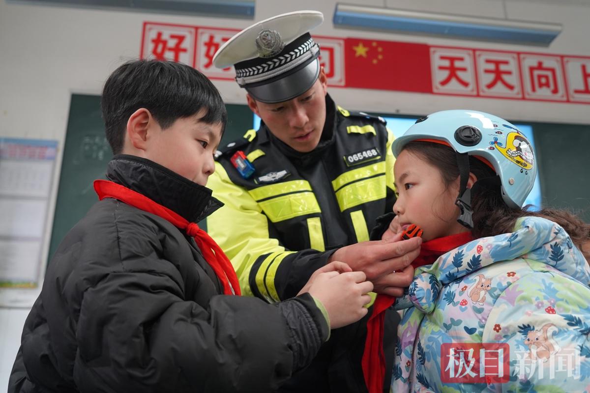 民警教学生正确佩戴安全帽