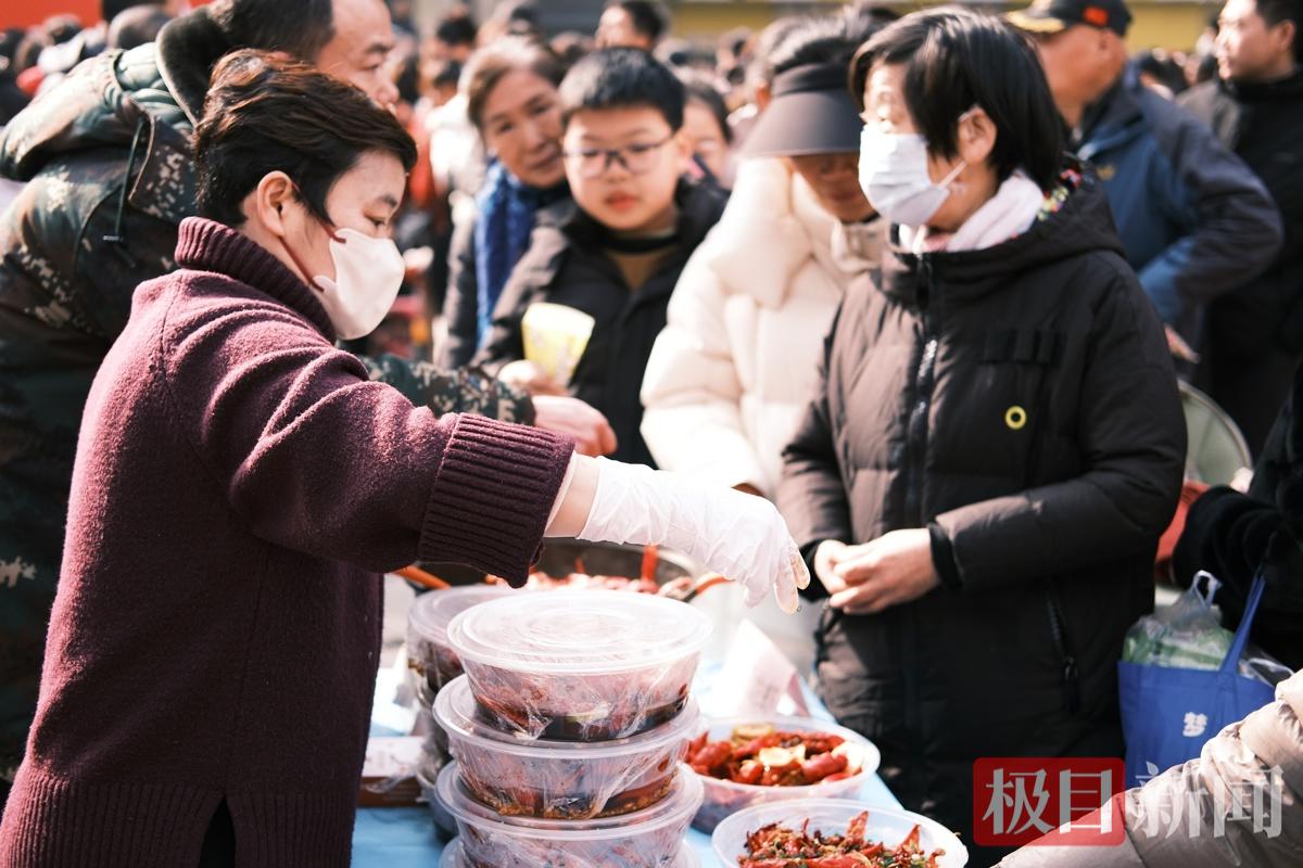 带着孙子来逛年货节的张大爷,手里端着小龙虾,笑得合不拢嘴:“我孙子平时就爱吃虾,今天能免费尝到这么正宗的潜江龙虾,高兴得不得了。”