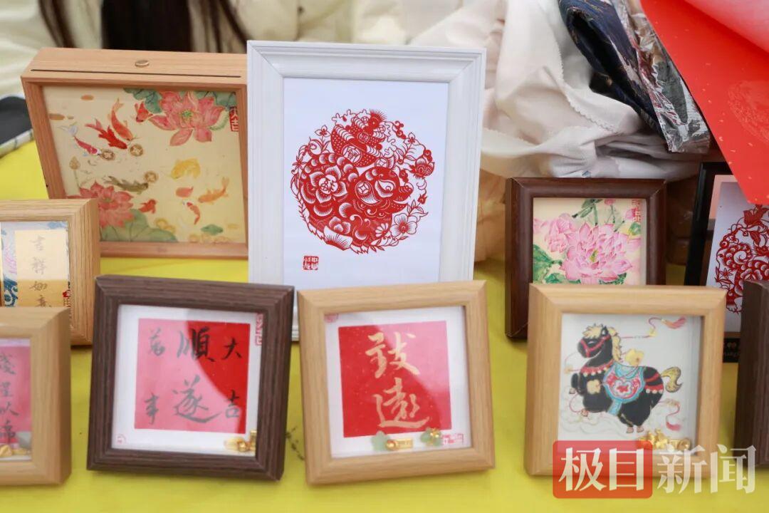 与热闹的年货区相映成趣的,是一方充满文化韵味的天地。栩栩如生的雕花剪纸上,花鸟跃然,引来围观居民的阵阵赞叹。