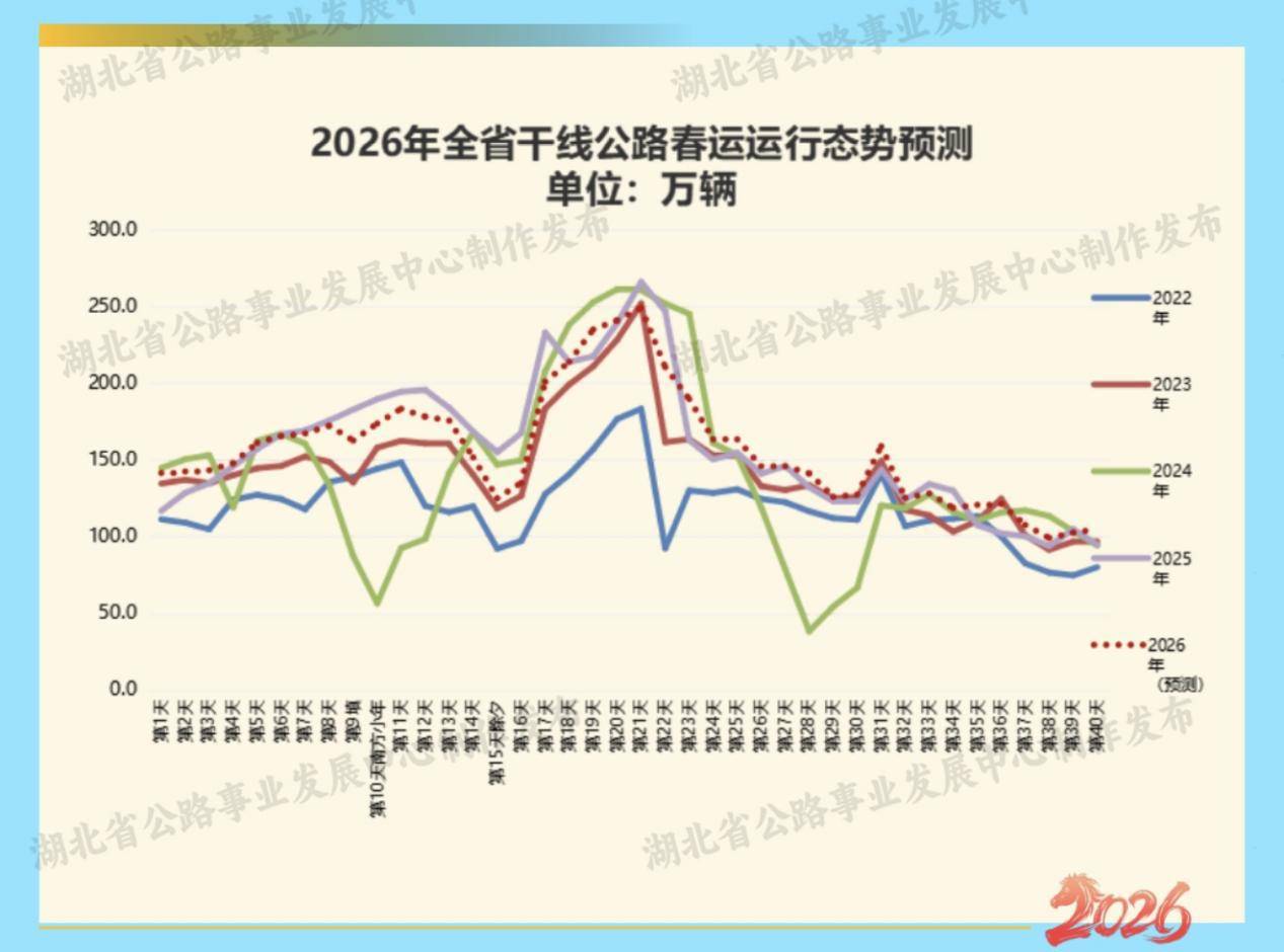 第二阶段:春运中期(2月15日至2月23日,共9天,春节期间)。春节期间,收费公路对小型客车实行免收通行费政策,流量以小型客车探亲出行为主,货运车流主动避峰,客车占比约为97%,货车占比约为3%,路网流量特征呈前低后高趋势。其中,2月15日、16日(腊月廿八、除夕),全省干线公路流量相对平稳;2月17日至19日(正月初一至初三),路网流量回暖上升,以武汉及各市州为中心向周边县市发散;2月20日至23日(正月初四至初七),预计返程车流相对集中,各县市车流向重点城市汇聚,潮汐特征明显。此阶段是春运期间日均流量最大的阶段,并形成春运期间第一波流量高峰,预判峰值日出现在2月22日(正月初六)。